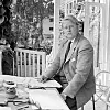 Bo Setterlind sittande på utomhusverandan och redigerar, Ekegården i Strängnäs.