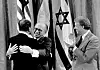 Egyptiske presidenten Anwar Sadat (t v) och Israels premiärminister Menachem Begin omfamnar varandra bredvid president Jimmy Carter vid tillkännagivandet av fredsavtalet i september 1978. En bedrift som Sadat och Begin senare skulle få ta emot Nobels fredspris för.