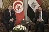 Tunisiens utrikesminister Mohamed Ali Nafti och Egyptens dito Badr Abdelatty fotograferades inför Arabförbundets möte i Tahrirpalatset i Kairo.