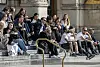 De yngre verkar börja få ett större intresse för Bibeln än de äldre i Sverige. Bilden visar människor som njuter av vårvärmen på Dramatens trappa i Stockholm.