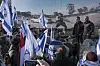 Både proisraeliska och propalestinska grupper hade samlats utanför den internationella domstolen i Haag inför beskedet om folkmordsanklagelsen mot Israel. Bakom de proisraeliska demonstranterna syns bilder från Hamas massaker i Israel den 7 oktober.