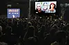 Emily Damari, Romi Gonen och Doron Steinbrecher, som syns på skärmen, välkomnas med öppna armar i Israel.