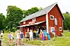 Vi närmar oss Torp. På håll ser vi den röda mötesladan som gör sig bra mot den gröna naturen runt omkring. Här har midsommarkonferenser hållits sedan år 1887, när gårdsarrendatorn Edvard Hedin bjöd in till den allra första konferensen.