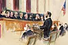 Högsta domstolen har nu hört båda sidor i frågan om Texas abortlag. På illustrationen ses domarna i Högsta domstolen till vänster. Mannen som står upp är representant för en abortklinik.