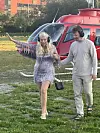 Gunilla Persson anlände i helikopter till Emilia Lindbergs tältmöte i Örnsköldsvik, i samma kläder som hon bar under Melodifestivalen i våras.