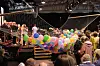 Ett fisknät fyllt med färgglada ballonger hänger i möteshallen under den