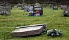 Kriminalitet och skadegörelse är ett växande problem på landets kyrkogårdar. Bilden visar hur en gravsten välts i Partille vid ett tidigare tillfälle.