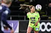 Carly Wickenheiser har blicken på bollen i en match med sitt förra lag Kristianstad. Numera spelar hon för SM-guldfavoriten Häcken och Kanadas landslag.