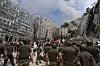 Räddningsarbetare, volontärer och vårdpersonal söker igenom rasmassorna vid barnsjukhuset Ochmatdyt i Kiev.