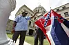 Delstatsanställda hissar Mississippis flagga i staden Jackson, tisdagen den 30 juni. Senare samma dag skrev guvernören Tate Reeves under en lag som skrotar den 126 år gamla flaggan på grund av dess kontroversiella sydstatsemblem.