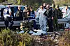 Polis, militär och vårdpersonal står vid den person som dödats och nu fått ett vitt lakan över sig. Till höger syns en av de ihjälskjutna gärningsmännen.