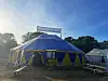 Tältmötena arrangeras på en äng några húndra meter från Senorens missionshus. Till höger syns cafétältet där människor åt grillad korv och hade gemenskap.