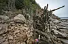 Nimis är skapat på en strand i naturreservatet Kullaberg av konstnären Lars Vilks, som nyligen omkom i en bilolycka. Rent formellt är det fråga om ett svartbygge, menar länsstyrelsen.