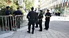 Polisen sätter ut kravallstaket innan koranbränningen utanför moskén vid Medborgarplatsen.
