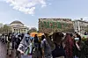 Hjälmförsedda Columbiastudenter skriker ut sin ilska mot Israel och Israels krig mot Hamas. Det sker samtidigt som vissa av dem tar över den 118 år gamla byggnaden Hamilton Hall, som även spelade en central roll i studentprotesterna 1968. Dörrar barrikaderas och glasrutor slås sönder, rapporterar The New York Times.