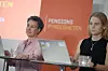 Pensionsspecialist Agneta Claesson (vänster) och analytiker Linda Wiese under Pensionsmyndighetens pressträff om pensionerna för 2024.