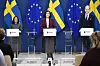 Kulturminister Parisa Liljestrand (M), utbildnings- och integrationsminister Simona Mohamsson (L) och Mathias Bengtsson (KD) presenterar förslag om insynen i friskolor.