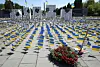 En installation i Polens huvudstad Warszawa representerar ryska krigsbrott i Ukraina.