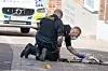 Polisens kriminaltekniker i arbete på den trottoar i centrala Helsingborg där en kvinna på tisdagen utsattes för ett knivdåd.