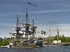 Ostindiefararen "Götheborg" gick på grund 1745 och sjönk alldeles utanför Göteborgs hamninlopp. Bilden visar en replika av fartyget vid ett av sina besök i Stockholm.