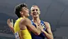 Armand Duplantis och Sam Kendricks gratulerar varandra efter finalen i stavhopp i friidrotts-VM.
