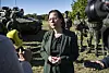 Utrikesminister Maria Malmer Stenergard ger en kommentar i samband med att hon och försvarsminister Pål Jonson tar emot Lettlands försvarsminister Andris Sprūds på Södra skånska regementet P7 i Revingehed.