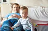 En liten pojke med Downs syndrom leker med sin pappa hemma i vardagsrummet.