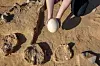 En arkeolog visar ett färskt strutsägg bredvid de omkring 4 000 år gamla äggfragment som hittats i Negevöknen i Israel.