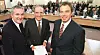 Den 10 april 1998 i Belfast undertecknades den så kallade Långfredagsöverenskommelsen, av bland annat irländske premiärministern Bertie Ahern (t v) och brittiske premiärministern Tony Blair (t h), här med amerikanske senatorn George Mitchell. Avtalet syftade till att avsluta decennier av blodiga konflikter i Nordirland.
