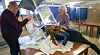 Medlemmar i folkomröstningskommittén tömmer en valurna för att börja räkna rösterna.