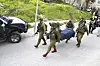 Israeliska soldater bär på en av de två palestinska terrorister som dödades efter attacken i Hebron i mars.