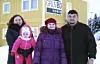 Sergej tillsammans med sin hustru och deras två döttrar utanför Migrationsverkets asylboende i lappländska Pajala där de nu väntar på att asylutredningen ska inledas.