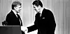 President Jimmy Carter och republikanernas presidentkandidat Ronald Reagan, skakar hand före en debatt i Cleveland, Ohio, oktober 1980.