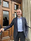 Han sitter och väntar utanför Brogyllens café