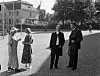 Ärkebiskop Erling Eidem med sällskap utanför Universitetshuset, Uppsala. I bakgrunden skymtar Ärkebiskopsgården