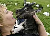 Getrud i famnen på Victoria Mårtensson Winberg i hagen på Glada getens gårdsmejeri i Lilla Oberöd utanför Hässleholm.