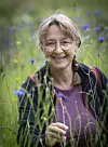 Lotta Fabricius Kristiansen, forskningsassistent på SLU Råd Nu som är en del av Sveriges lantbruksuniversitet, står mitt i blomsterängen i Kivik.